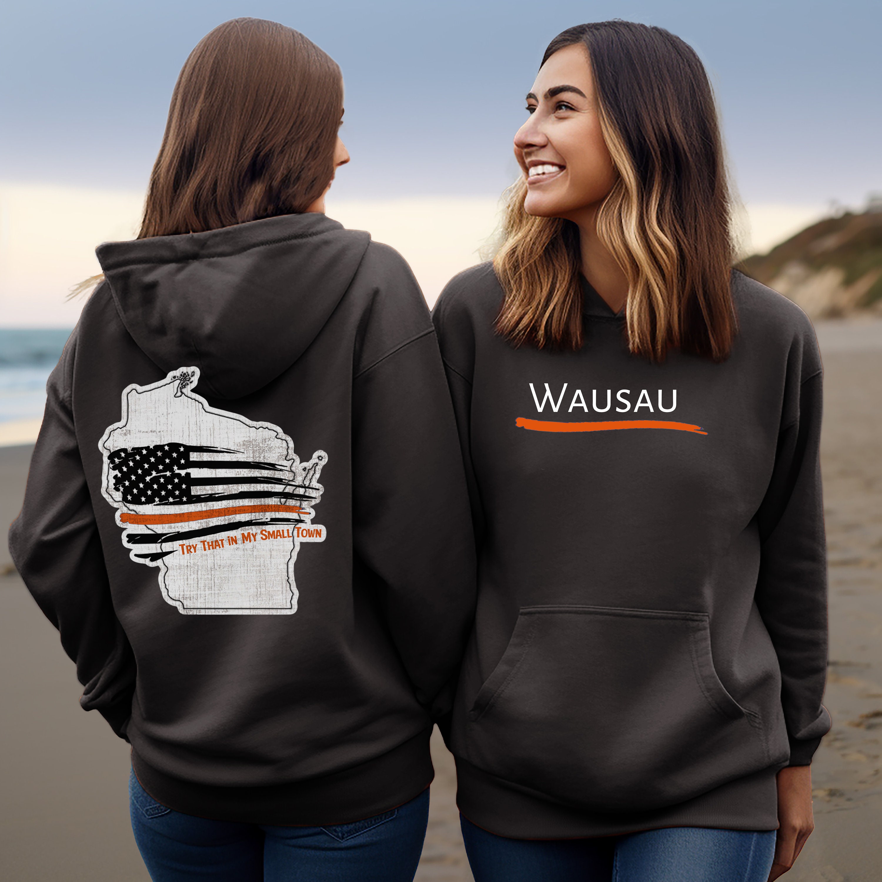 The front of this hoodie features your CUSTOM TOWN NAME and a Thin Line of the color you support. The back of the hoodie displays an outline of the state of Wisconsin with the thin line America flag and "Try That in My Small Town".