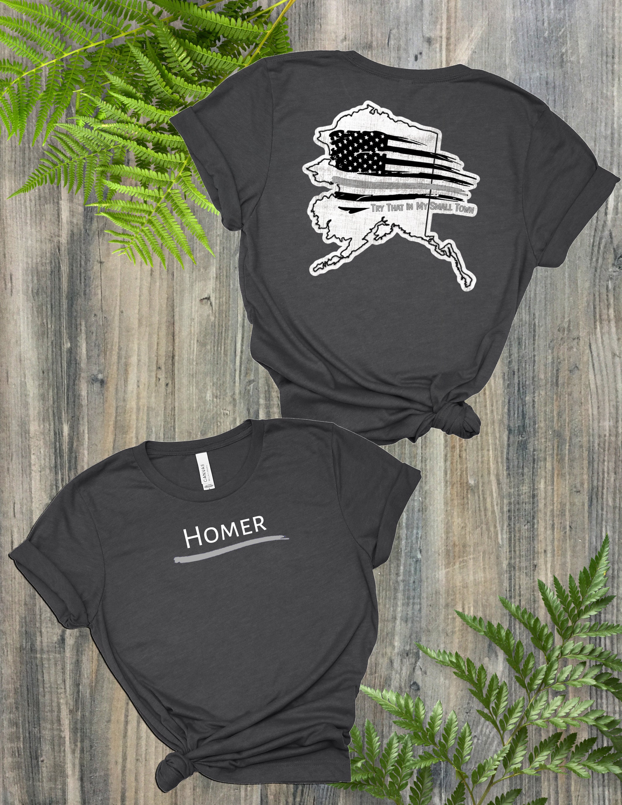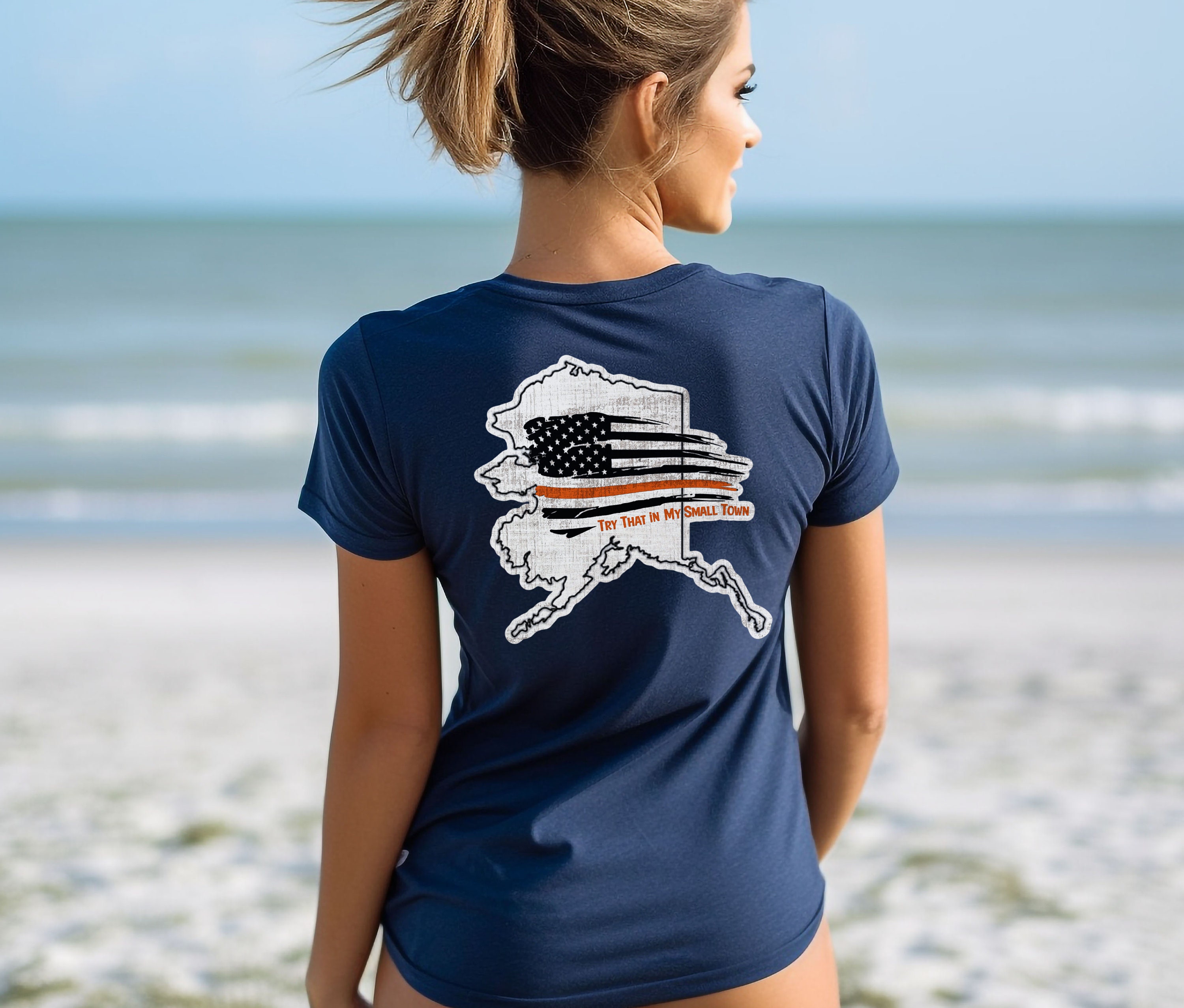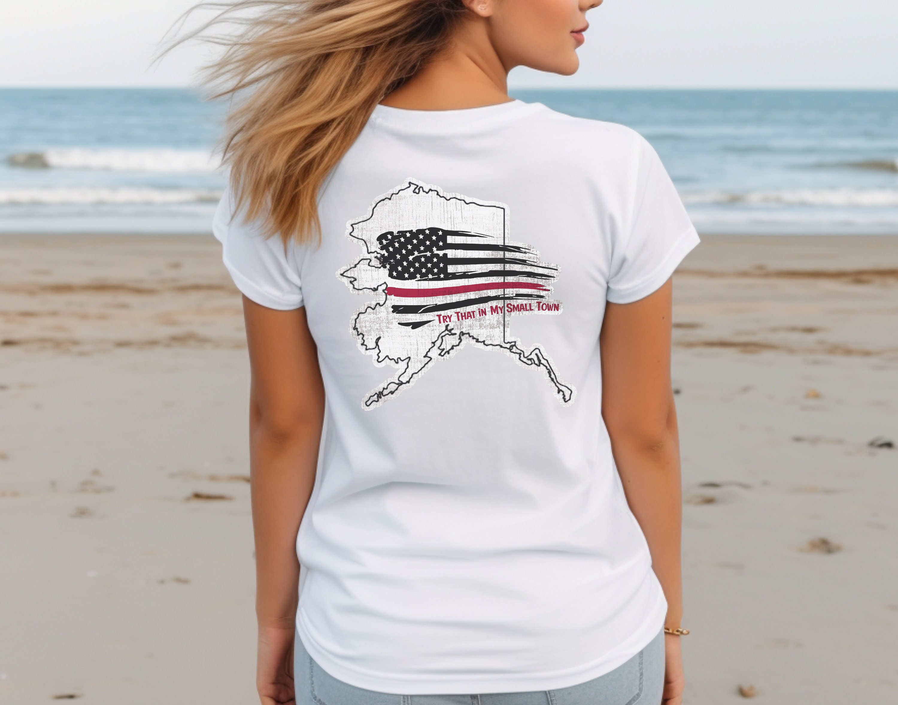 The front of this shirt features your CUSTOM TOWN NAME and a Thin Line of the color you support. The back of the shirt displays an outline of the state of Alaska with the thin line America flag and "Try That in My Small Town".
